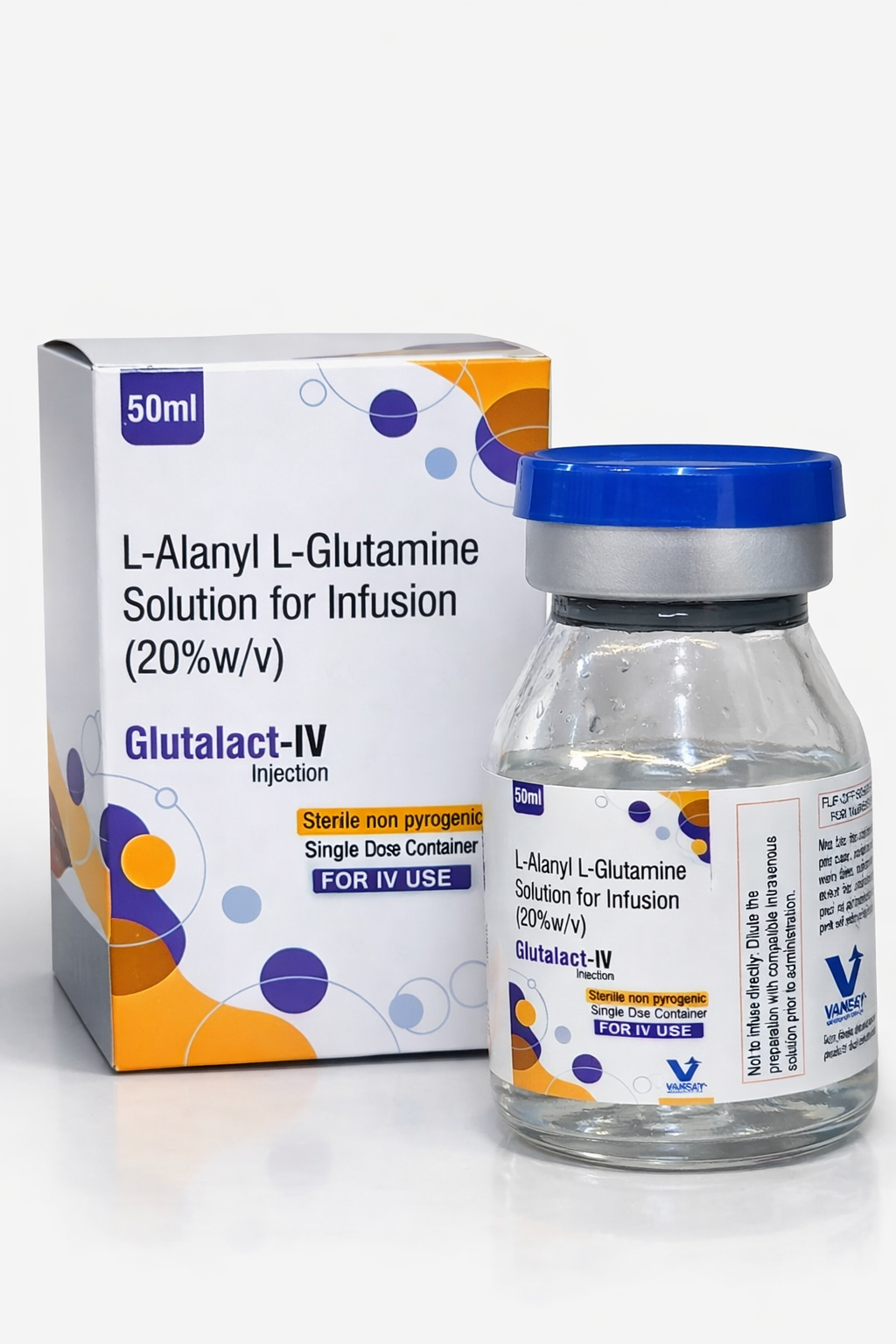 GLUTALACT-IV Injection (L-Alanyl L-Glutamine 20% w/v) is a nutritional infusion used to support patients with increased metabolic needs or amino acid deficiency. It contains L-Alanyl L-Glutamine, a stable dipeptide that provides L-Glutamine and L-Alanine, essential for recovery and cellular function.
