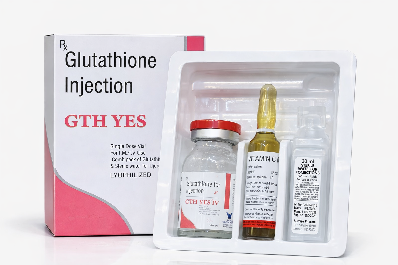 GTH YES IV Injection (Glutathione 600 mg with Vitamin C) is an antioxidant-based formulation used to support detoxification, improve skin health, and protect cells from oxidative stress. It contains Glutathione, a naturally occurring antioxidant, along with Vitamin C, which enhances its stability and effectiveness.