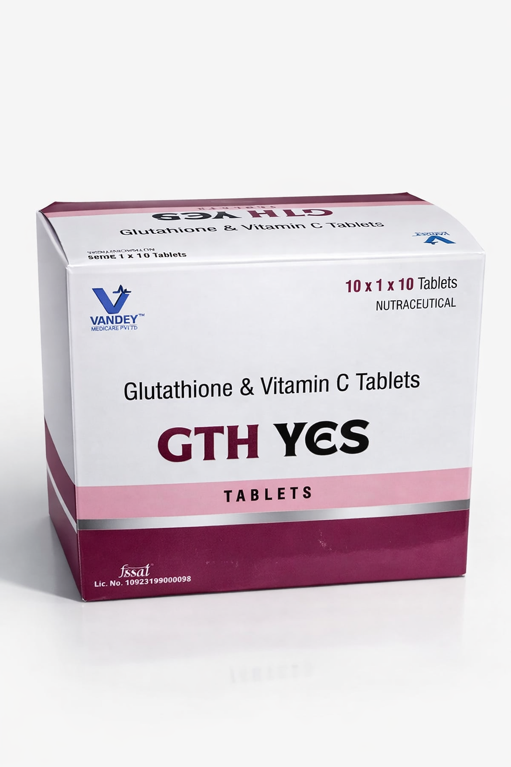 GTH YES Tablets (Glutathione 600 mg + Vitamin C 100 mg) is an antioxidant supplement designed to support detoxification, skin health, and overall cellular protection. It contains Glutathione, a powerful antioxidant that helps neutralize free radicals, along with Vitamin C, which enhances antioxidant activity and supports immune function.