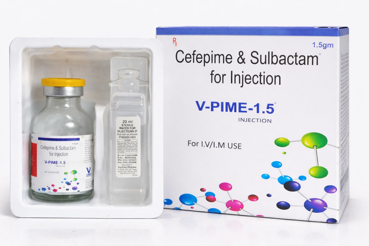 V-PIME 1.5 Injection (Cefepime 1000 mg + Sulbactam 500 mg) is a combination antibiotic used for the treatment of moderate to severe bacterial infections. It contains Cefepime and Sulbactam, which work together to enhance antibacterial effectiveness.